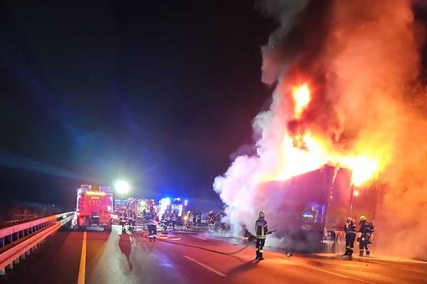 Wie berichtet, war gegen 21:25 Uhr die Zugmaschine eines Sattelzuges vermutlich aufgrund eines technischen Defekts auf dem Seitenstreifen in Brand geraten. Das Feuer griff auf den Auflieger über und beschädigte nach derzeitigem Kenntnisstand rund 20 IBC-Behälter, die mit unterschiedlichen säurehaltigen Produkten befüllt waren.