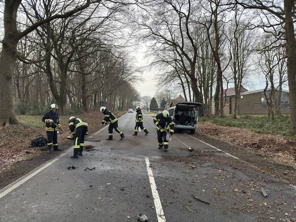 Nachdem die Verletzten den nahegelegenen Krankenhäusern zugeführt worden waren, räumten die Feuerwehrleute verstreute Trümmerteile von der Fahrbahn und reinigten die Straße grob unter Zuhilfenahme von Besen. Ein angefordertes Abschleppunternehmen übernahm die Bergung des völlig zerstörten Unfallwagens. Zudem rückte die Kreisstraßenmeisterei an, um die teilweise ausgetretenen Betriebsstoffe begutachten und die anschließende Reinigung der Fahrbahn durch eine Fachfirma in Auftrag geben zu können. Der Einsatz für die Feuerwehr war nach einer Stunde beendet, die Brockzeteler Straße blieb im Bereich des Unfallorts noch kurzzeitig gesperrt.