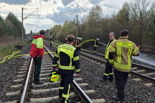 Südheide (ots) - Am Freitagnachmittag wurde die Feuerwehr Unterlüß sowie 5 Wehren aus dem LK Uelzen an die Bahnstrecke zwischen Unterlüß und Suderburg alarmiert. Auf einer Länge von rund einem Kilometer brannte die Böschung westlich der Bahn in den Landkreisen Uelzen und Celle an insgesamt fünf Stellen. Im Einsatz befanden sich zahlreiche Einsatzkräfte, die gemeinsam die Ausbreitung der Brände verhinderten und Glutnester ablöschten. Aufgrund der Streckensperrung kam es zwischen Uelzen und Hannover zu erheblichen Einschränkungen im Bahnverkehr. Neben den Kräften der Feuerwehren machten sich auch der Notfallmanager, der zuständige Revierförster und die Bundespolizei ein Bild von der Lage.