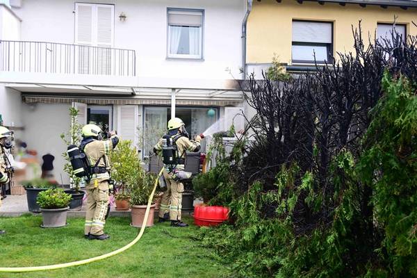 Am Freitagmittag (10.04.) wurden die freiwilligen Löschzüge Pulheim, Stommeln und Geyen mit der hauptamtlichen Wache zu einem Feuer in die Schubertstraße in Pulheim gerufen. Hier sollte eine Thuja-Hecke, die den Garten zweier Reihenhäuser trennt und direkt an diese Häuser grenzt, brennen. Als die Feuerwehr unter Einsatzleitung von Brandoberinspektor Thomas Schmickler in die Straße einfuhr, war bereits die Rauchsäule erkennbar. Die Kräfte der Feuerwehr begannen unter Atemschutz sofort mit ihren Löschmaßnahmen an der etwa drei Meter hohen Hecke. Eigene Löschversuche der Anwohner und Nachbarschaft mit einem großvolumigen Schlauch konnten eine Ausbreitung des Feuers zwar behindern, letztlich aber nicht löschen. Das Feuer war durch den Einsatz der Feuerwehrkräfte, die sich mit sieben Fahrzeugen und gut 30 Kräften auf den Weg zur Einsatzstelle gemacht hatten, dann schnell unter Kontrolle gebracht und gelöscht. Durch das rasche Vorgehen aller Beteiligten konnten zwar verhindert werden, dass das Feuer auf das Haus überschlug, aber nicht, dass Teile einer Terrassenüberdachung zu Schaden kamen. Die letzten Kräfte konnten nach gut einer halben Stunde die Einsatzstelle an die Eigentümer übergeben und wieder zu ihren Standorten zurückkehren.
