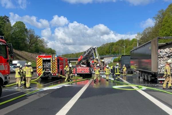 Bei Eintreffen der weiteren Einsatzkräfte bestätigte sich die gemeldete Lage. Die Ladung eines Sattelschleppers war in Brand geraten. Der Fahrer hatte die Zugmaschine bereits eigenständig vom Auflieger getrennt. Bei der Ladung handelte es sich um kunststoffhaltigen Schrott.