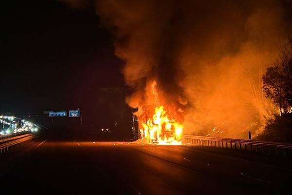 Vermutlich aufgrund eines technischen Defekts geriet am Montagmorgen pünktlich zum Berufsverkehr ein Autotransporter in Brand. Der Fahrer konnte den mit Elektroautos beladenen Transporter, kurz vor Kaiserslautern-West noch auf den Seitenstreifen lenken. Die herbeieilende Berufsfeuerwehr löschte den Brand unter anderem mit Löschschaum. Zum Zweck der Lösch- und Bergungsarbeiten musste die Autobahn in Fahrtrichtung Saarbrücken mehrfach voll gesperrt werden, was zu Verkehrsbeeinträchtigungen führte. Mittlerweile fließt der Verkehr einspurig in Richtung Saarbrücken. Der Sachschaden bewegt sich im mittleren sechsstelligen Bereich. Der Fahrer blieb unverletzt. |pastkl