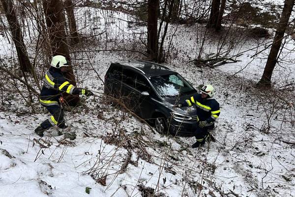 Ein PKW kam aufgrund widriger Verhältnisse auf einer spiegelglatten Fahrbahn, trotz angelegter Schneeketten, ins Rutschen und stürzte in weiterer Folge über die Böschung in den Wald.