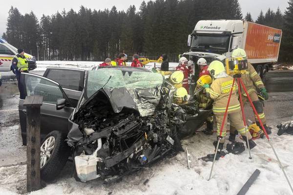 Schwerer Verkehrsunfall zwischen einem LKW und PKW, zwei Personen noch im PKW.
