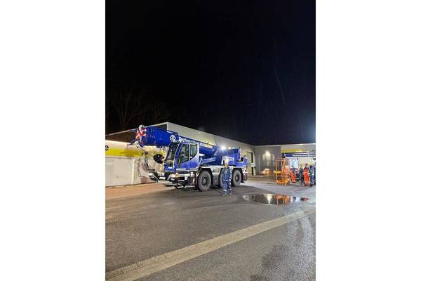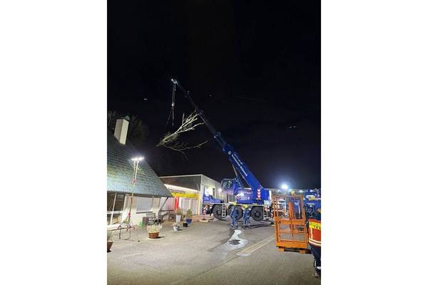 Nachdem der Kran in Stellung gebracht worden war, konnte der Baum angeschlagen und kontrolliert in zwei Teile zersägt werden. Diese wurden anschließend mithilfe des Krans über das Gebäude hinweg nach vorne gehoben.