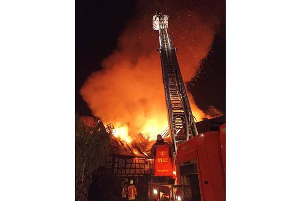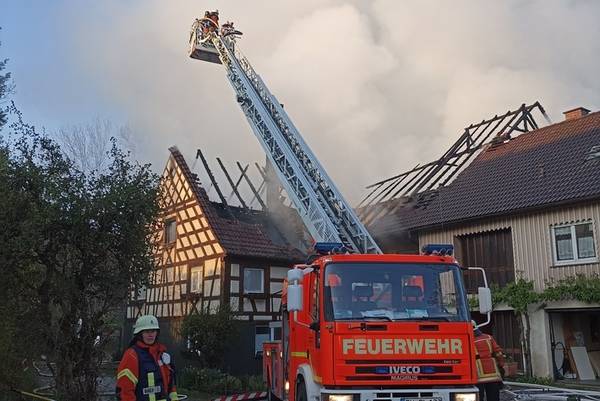 In den frühen Morgenstunden des Montag, stand in der Ortsmitte von Leupolz in Wangen im Allgäu, ein ehemaliges Ökonomiegebäude das zuletzt al Schreinerwerkstatt genutzt worden war, im Vollbrand. Die alarmierten Feuerwehren aus Wangen, mit den Abteilungen Stadt, Leupolz und Karrsee wurden zusätzlich von einer weiteren Drehleiter aus Leutkirch und dem Gerätewagen-Atemschutz aus Weingarten unterstützt. Insgesamt waren rund 80 Feuerwehrkräfte mit 19 Fahrzeugen im Einsatz. Gegen 5.30 Uhr war das Feuer unter Kontrolle. Auch das DRK-Wangen und die Johanniter waren zur Betreuung der Bewohner und Einsatzkräfte im Einsatz. Die Wasserversorgung über das örtliche Hydrantennetz wurde durch mehrere Leitungen aus einem offenen Gewässer ergänzt. Auch vor Ort waren Oberbürgermeister Michael Lang, Ortsvorsteher Anton Sieber und Kreisbrandmeister Oliver Surbeck. Einsatzleiter war Stadtrbrandmeister Christoph Bock. Die Löschmaßnahmen zogen sich bis in die Vormittagsstunden und dauern aktuell (9.15Uhr) noch an. Wegen der Vielzahl an verstecken Glutnestern werden die Nachlösch und Aufräumarbeiten sich vermutlich noch über den ganzen Tag ziehen.