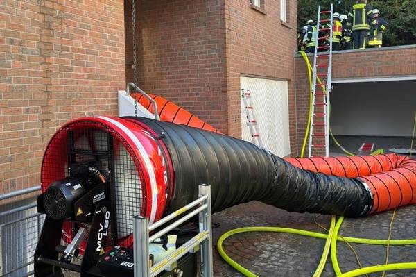 Parallel wurde eine Öffnung des Daches mit einer Rettungssäge durchgeführt, um eine Abluftöffnung zu schaffen. Erstmalig kam der neue mobile Großventilator zur Belüftung zum Einsatz, mit dem umfangreiche Lüftungsmaßnahmen durchgeführt wurden.