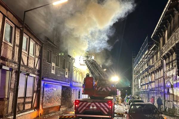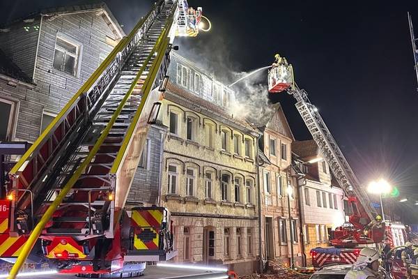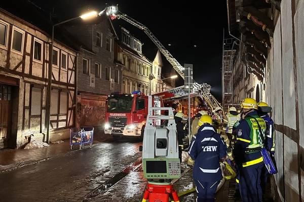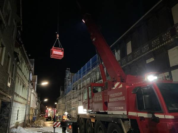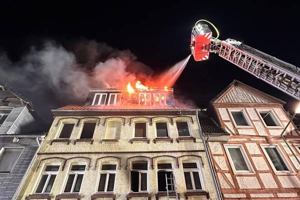 15.01.2026, 17:15 Uhr. Langer Steinweg, Helmstedt. Gemeldet wurde ein Wohnungsbrand mit Menschenleben in Gefahr. Bei Ankunft des Einsatzleiters schlugen ihm bereits aus mehreren Fenstern die Flammen aus dem Gebäude entgegen. Zwei Personen waren zu diesem Zeitpunkt noch mindestens im Gebäude. Bei Eintreffen der ersten Kräfte wurde umgehend mit der Menschenrettung und Brandbekämpfung begonnen. Zwei Personen wurden mittels Drehleiter aus dem völlig verrauchten 2. OG gerettet. Parallel gingen mehrere Trupps unter Atemschutz zur Brandbekämpfung vor. Es zeigte sich jedoch schnell, dass die massive Brandausweitung auf das gesamte Gebäude übergriffen hatte, so dass ab dem 1. OG die Decken bis durch das Dach durchgebrannt waren. Ein Innenangriff war dann nicht mehr möglich. Auch der Einsatz von zwei Drehleitern (Helmstedt, Grasleben) konnte ein Durchzünden des Dachstuhls hin zu einem offenen Dachstuhlbrand nicht verhindern. Aufgrund des Einsatzverlaufes wurden umgehend weitere Einsatzkräfte nachgefordert. Zwischenzeitlich drohte das Feuer auf die benachbarten Gebäude überzugreifen, dies konnte jedoch mit einem massiven Löschangriff erfolgreich verhindert werden. Die Ortsfeuerwehr Königslutter stellte dennoch eine dritte Drehleiter zur Verfügung, um ggf. sofort reagieren zu können. Die Ortsfeuerwehren aus Wolsdorf, Samtgemeinde Velpke sowie aus Beendorf sammelten sich an der Feuerwehr Helmstedt und stellten weitere Atemschutzgeräteträger zur Verfügung. Durch die Leitstelle Helmstedt-Wolfsburg wurde eine Bevölkerungswarnung über die Warn-Apps geschaltet, aufgrund der starken Rauchentwicklung.