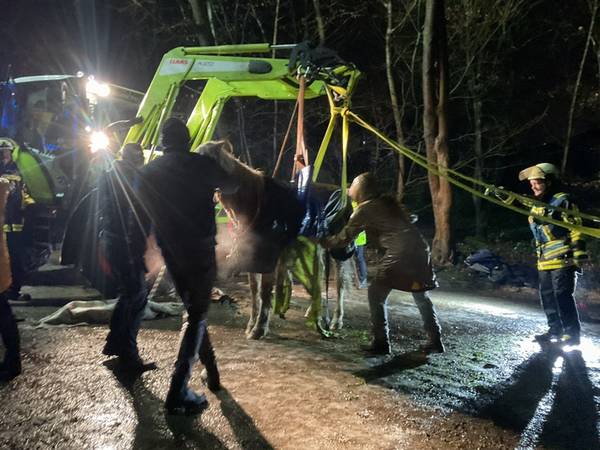 Am Montagabend (12. Januar) wurde die Feuerwehr Bochum gegen 18:45 Uhr zu einem besonderen Einsatz alarmiert: Ein Pferd war im Bereich des Forstrings am Waldrand in Höntrop auf vereistem Untergrund gestürzt und konnte sich nicht mehr selbstständig aufrichten. In enger Abstimmung mit der Eigentümerin sowie in Zusammenarbeit mit einer Tierärztin und einem örtlichen Landwirt gelang es den Einsatzkräften, das Tier sicher wieder auf die Beine zu bringen. Zum Einsatz kamen dabei ein Frontlader des Landwirts sowie das spezielle Hebegeschirr für Großtiere der Feuerwehr Bochum. Während der gesamten Rettungsaktion überwachte die Tierärztin den Gesundheitszustand des Pferdes. Nach erfolgreichem Aufrichten konnte das Tier der Eigentümerin und der Tierärztin übergeben werden. Glücklicherweise war das Pferd anschließend in der Lage, aus eigener Kraft zurück zu seinem Reiterhof zu laufen. Der Einsatz dauerte rund zwei Stunden und wurde von insgesamt 12 Einsatzkräften der Feuerwehr Bochum durchgeführt.