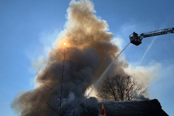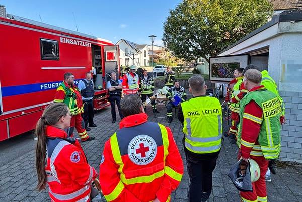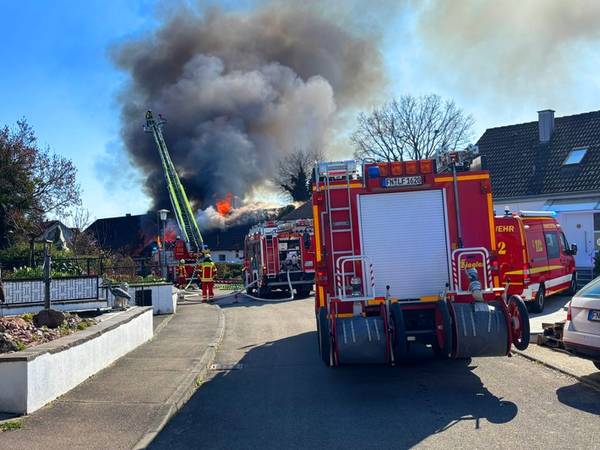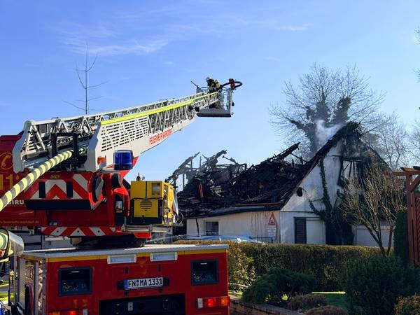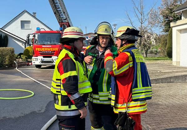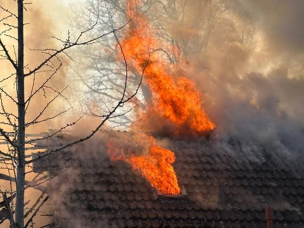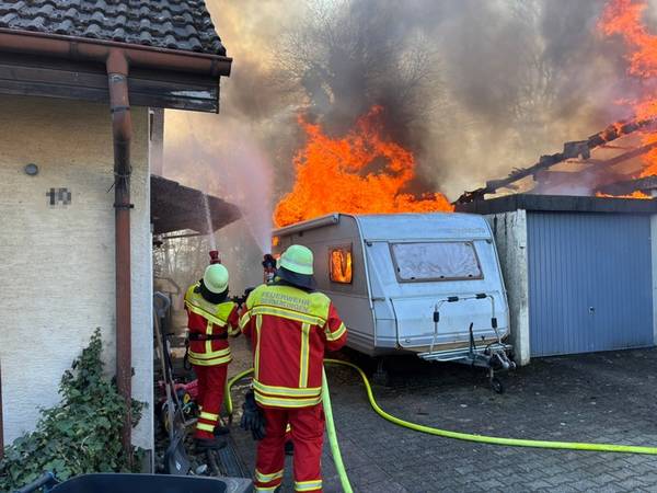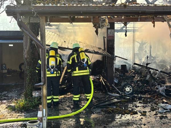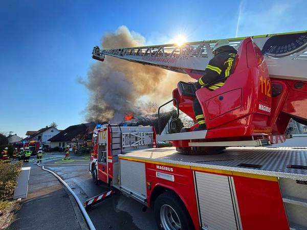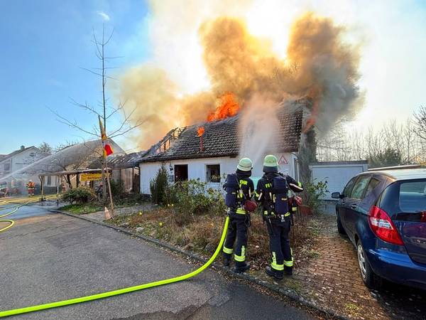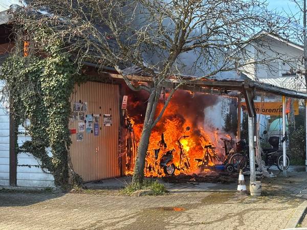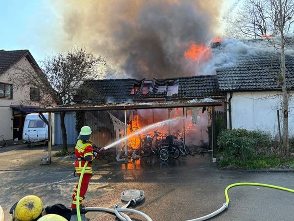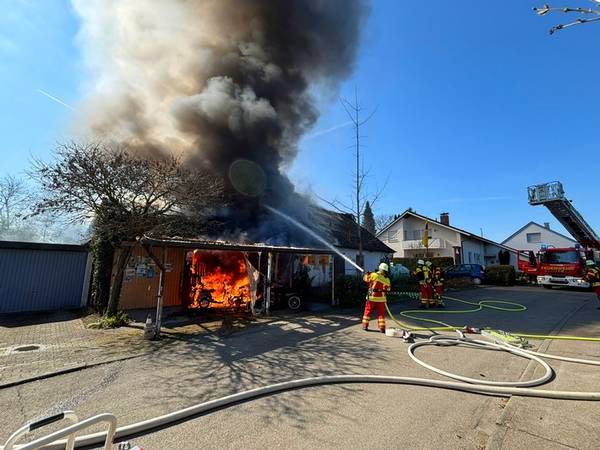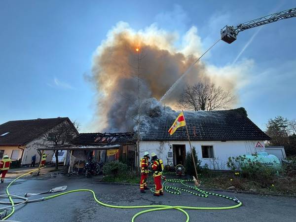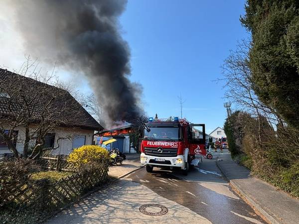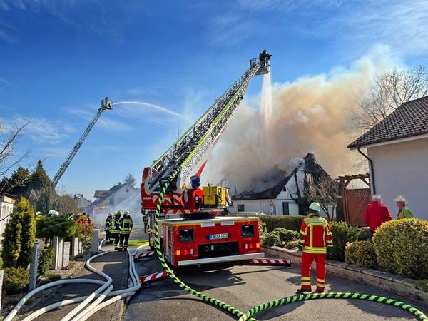 Am Freitagmittag (20.März 2026), kurz nach 13 Uhr, kam es in der Ringstraße in Bermatingen (Bodenseekreis) zu einem Brand einer Werkstatt in einem Wohngebiet, der in Folge auf das dazugehörende Wohnhaus übergriff. Schon auf der Anfahrt konnten die um 13.17 Uhr alarmierten Einsatzkräfte eine dichte schwarze Rauchwolke sehen und das Alarmstichwort erhöhen, um direkt weitere Kräfte hinzuzuziehen. Beim Eintreffen der Einsatzkräfte der Freiwilligen Feuerwehren Bermatingen und Markdorf stand der angebaute Carport- und Werkstattbereich mit zahlreichen Fahrrädern bereits im Vollbrand. Personen waren zum Zeitpunkt des Brandausbruchs nicht anwesend, so dass die Feuerwehr sofort eine massive Brandbekämpfung mit mehreren Strahlrohren einleitete. Als Schwierigkeit zeigte sich, dass die Wasserversorgung aus dem Hydrantennetz in dem betreffenden Bereich nicht optimal war, weswegen die Schlauchwagen aus Markdorf und Salem, sowie Tanklöschfahrzeuge alarmiert wurde, um hier eine separate Löschwasserversorgung aufzubauen. Zur Einsatzunterstützung war auch der große Einsatzleitwagen aus Friedrichshafen, der Gerätewagen Atemschutz-Strahlenschutz aus Markdorf und Löschfahrzeuge der umliegenden Wehren mit vor Ort. Starke Kräfte des Rettungsdienstes und Helfer der Einsatzgruppen der Bereitschaften (EgB) des DRK aus Markdorf und Immenstaad standen zur Absicherung und Versorgung der der Einsatzkräfte bereit. So wurde gegen später auch Verpflegung für die eingesetzten Helfer bereitgestellt. Leider konnte die Feuerwehr nicht verhindern, dass auch das Dachstuhlgeschoß des Gebäudes, sowie ein auf dem Nachbargrundstück geparkter Wohnanhänger ein Raub der Flammen wurden. Verhindert werden konnte erfolgreich, dass das Feuer auf die Nachbargebäude rechts und links und auf einen sich auf dem Grundstück befindlichen oberirdischen Flüssiggastank übergriff. Weiter wurden einige Gasflaschen aus dem Gefahrenbereich gebracht. Wegen der starken Rauchentwicklung wurde vorsorglich über den Warndienst NINA eine Warnung an die Bevölkerung versandt, mit der Bitte Fenster und Türen geschlossen zu halten. Gegen 15 Uhr war der Brand im Wesentlichen gelöscht. Die Nachlöscharbeiten zogen sich bis in den Abend. Eine Brandwache blieb zur Sicherheit vor Ort. Das Gebäude ist unbewohnbar, stark einsturzgefährdet und kann vorerst nicht betreten werden. Zur Höhe des Sachschadens, wie auch zur Brandursache hat die Feuerwehr keine Kenntnisse. Hierzu hat der Polizeiposten Markdorf die Ermittlungen aufgenommen. Die Polizei geht in einer ersten Schätzung von einem Sachschaden von bis zu 700.000 EUR aus. Die Feuerwehr war zeitweise mit bis zu 113 Einsatzkräften und 19 Fahrzeugen vor Ort im Einsatz. Im Feuerwehrhaus Markdorf befand sich eine Bereitschaft zur Sicherstellung des Grundschutzes in der Region. Die Ringstraße und zuführenden Straßen waren wegen der Einsatzmaßnahmen zweitweise gesperrt.