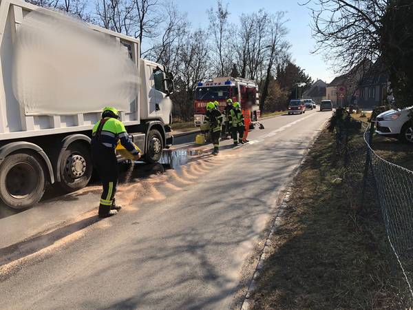 Am Vormittag verlor ein Müllwagen aufgrund eines Schlauchdefektes eine große Menge an Hydraulikflüssigkeit, welche sich auf der Straße verteilte. Am Einsatzort angekommen wurde auf die ausgelaufene Flüssigkeit Ölbindemittel verteilt und eingearbeitet. Zeitgleich wurde auch die Straßenmeisterei informiert, welche kurze Zeit später an der Einsatzstelle eintraf. Die Polizei regelte während des Einsatzes den Verkehr.