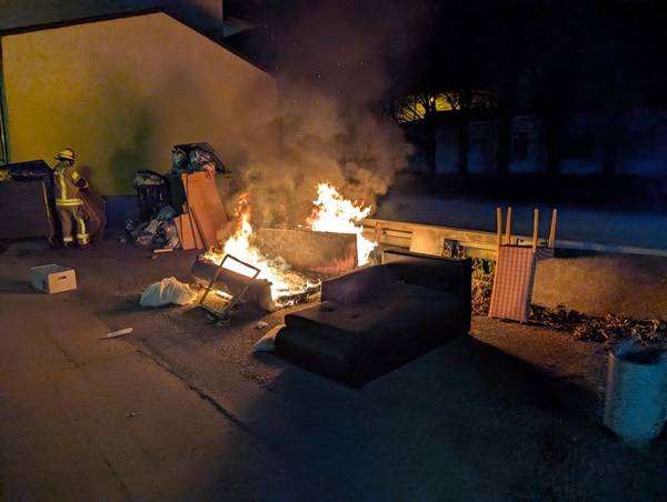 Um 23:15 Uhr ging es erneut in die Viernheimer Straße, gegenüber dem Bauhof. Eine Couch und Sperrmüll standen beim Eintreffen der Feuerwehr bereits im Vollbrand. Ein Angriffstrupp unter Atemschutz löschte das Feuer zügig. Eine Ausbreitung wurde verhindert. Auch hier ermittelt die Polizei zur Brandursache.