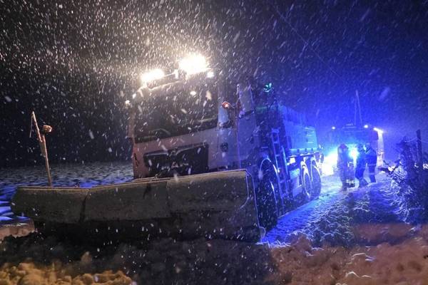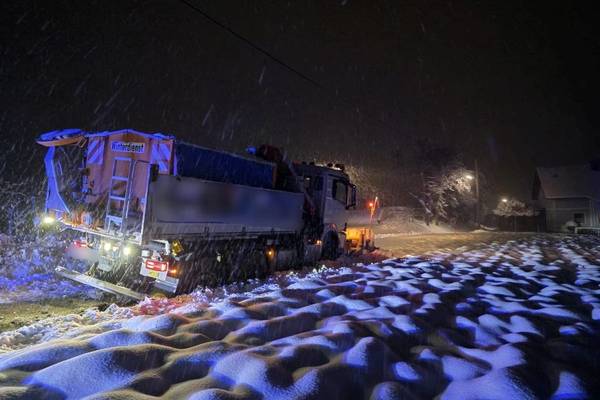 Ein Schneepflug, der im Dauereinsatz versuchte, die enormen Schneemassen zu beseitigen, blieb selbst im Schnee bzw. Schlamm stecken. Trotz intensiver Bemühungen des Fahrers grub sich das Fahrzeug immer tiefer in die aufgeweichte Schneedecke ein. Ein eigenständiges Freikommen war nicht mehr möglich.