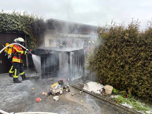 Ein Mülleimerhäuschen neben einer Hecke war aus noch ungeklärter Ursache in Brand geraten. Das Feuer drohte auf die angrenzenden Garagen überzugreifen.