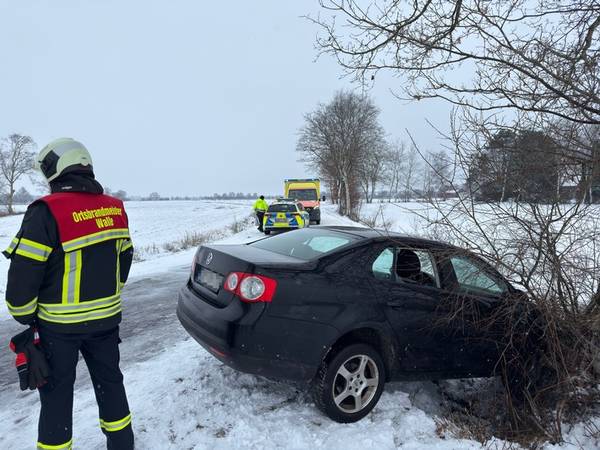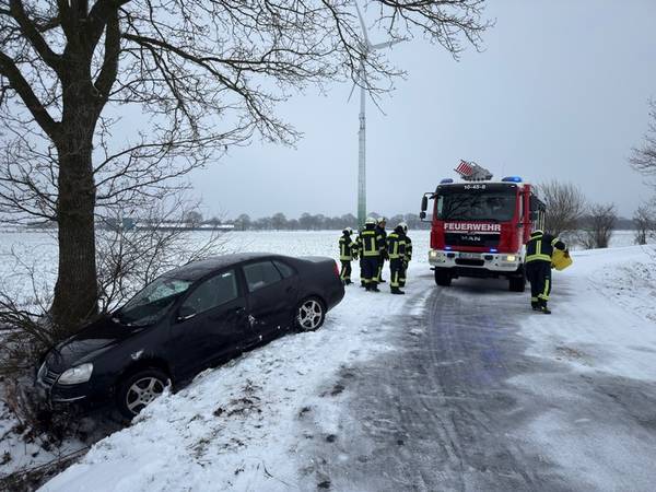 Auf eisglatter Fahrbahn ist ein PKW am Montagvormittag von der Straße Im Extumer Moor abgekommen und seitlich in einem Graben gelandet. Weil das Auto auf der Fahrerseite zum Liegen kam, ist der Fahrzeugführer in dem Wagen eingeschlossen worden. Der ersteintreffende Rettungsdienst forderte daraufhin die Unterstützung der Feuerwehr Walle an. Nach kurzer Inaugensscheinnahme der Begebenheiten vor Ort entschieden sich die Einsatzkräfte dazu, den PKW vorsichtig wieder aufzurichten. Im Anschluss konnte dem Mann aus dem Wagen verholfen und dieser an den Rettungsdienst übergeben werden, der ihn zur weiteren Versorgung ins Krankenhaus transportierte. Ein Abschleppunternehmen übernahm die Bergung des Autos, für die Feuerwehr Walle war der Einsatz nach etwa 30 Minuten beenden.