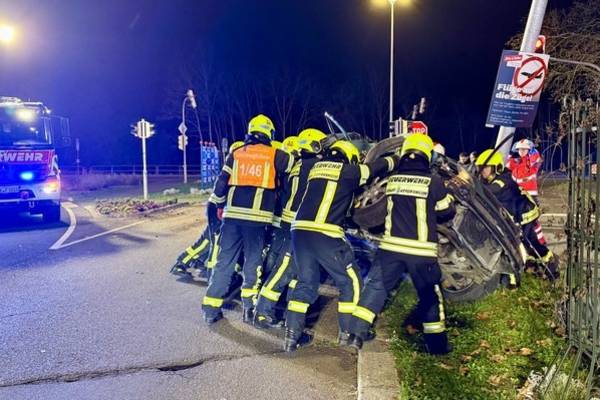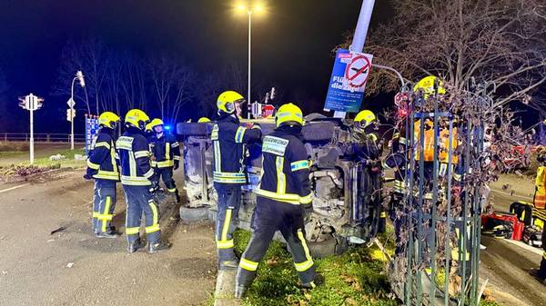 Hattersheim am Main (ots) - Feuerwehr, Rettungsdienst und Polizei wurden um 18:42 Uhr mit der Meldung "Unfall mit eingeklemmter Person - Pkw vs. Laterne" zur Kreuzung Südring/Frankfurter Straße in Hattersheim alarmiert. Ein Pkw war bei einem Alleinunfall zunächst gegen ein Straßenschild gefahren, kippte dann auf die Seite und prallte gegen einen Laternenmast.