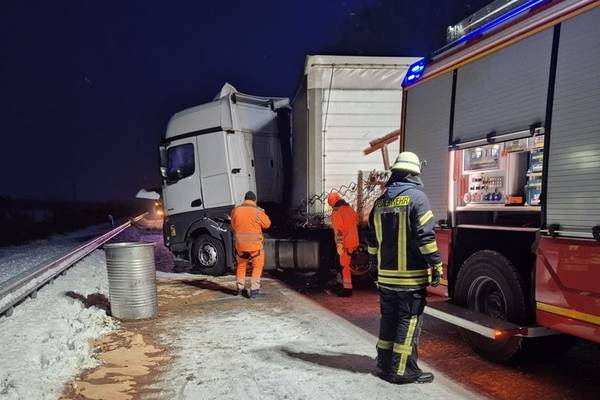 Ein Sattelzug war auf glatter Fahrbahn verunglückt. Dabei wurde der Dieseltank beschädigt. Die Feuerwehr musste den Tank zunächst abdichten, um eine weitere Ausbreitung des Kraftstoffs zu verhindern. Im weiteren Verlauf wurde der Diesel aus dem Tank abgepumpt. Der bereits ausgelaufene Kraftstoff wurde mit Bindemittel aufgenommen. Ob Personen zu Schaden gekommen sind, können keine Angaben gemacht werden.