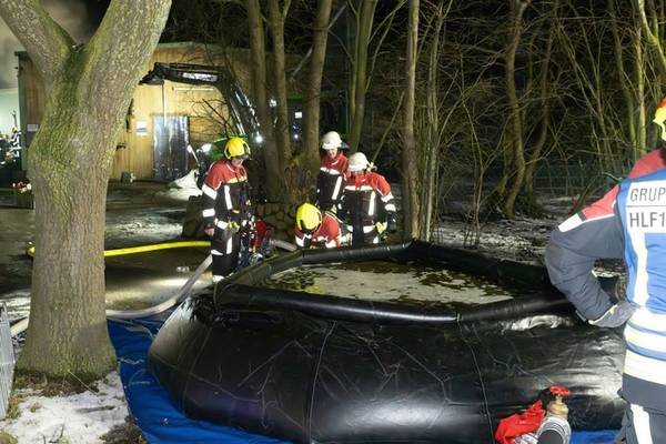 Zur Sicherstellung der Löschwasserversorgung wurde ein Faltbehälter aufgebaut, der mithilfe von Güllewagen befüllt wurde. Gegen 22:45 Uhr konnte der Leitstelle "Feuer unter Kontrolle" gemeldet werden. Für die Nachlöscharbeiten wurden mithilfe eines Radladers Teile des Blechdaches entfernt, um verbliebene Glutnester gezielt ablöschen zu können.
