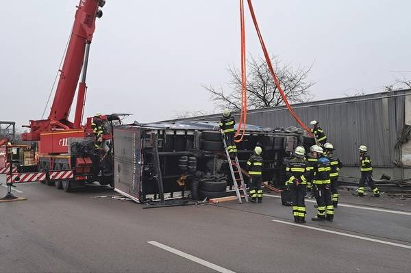 Ein Sattelauflieger war auf einen verkehrsbedingt bremsenden Lkw aufgefahren, der dadurch umkippte und quer über zwei Fahrspuren und dem Standstreifen zum Liegen kam. Dabei wurde die angrenzende Lärmschutzwand in Teilen stark beschädigt. Der zweite Lkw kam schwer beschädigt im Bankett an der Mittelleitplanke zum Stehen.