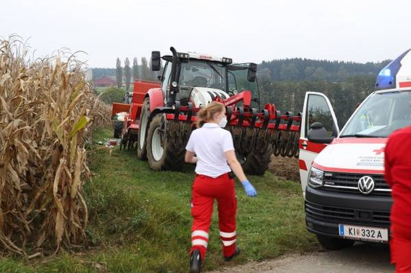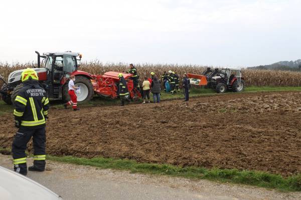 RIED IM TRAUNKREIS. Vier Feuerwehren, der Rettungsdienst und der Notarzthubschrauber wurden Samstagnachmittag zu einer Personenrettung nach einem landwirtschaftlichen Unfall nach Ried im Traunkreis (Bezirk Kirchdorf an der Krems) alarmiert. "Am 08. Oktober 2022 um 16:10 Uhr ereignete sich im Bezirk Kirchdorf an der Krems ein schwerer Arbeitsunfall. Ein 60-jähriger Landwirt war aus bisher unbekannten Gründen auf die am Heck montierte Saatgutmaschine gestiegen, vermutlich um diese nachzufüllen. Die 27-jährige Tochter des Landwirts, welche einen anderen Traktor lenkte, wollte zu diesem Zeitpunkt mittels frontmontierter Schaufel, auf welcher das Saatgut in Säcken aufgeladen war, das Saatgut zur Saatgutmaschine transportieren. Bei der Anfahrt zur Saatgutmaschine wurde der Landwirt zwischen Schaufel und Saatgutmaschine im Bereich der Unterschenkel beziehungsweise Schienbeine eingeklemmt. Die Tochter alarmierte sogleich die Rettung. Beim Eintreffen der Polizeistreife waren bereits Rettung sowie Feuerwehr vor Ort und führten die Erstversorgung des Schwerverletzten durch. Der 60-Jährige wurde mit dem Notarzthubschrauber Martin 3 in das UKH nach Linz geflogen", so die Polizei. Beim Eintreffen der Feuerwehr war der Verletzte bereits befreit.