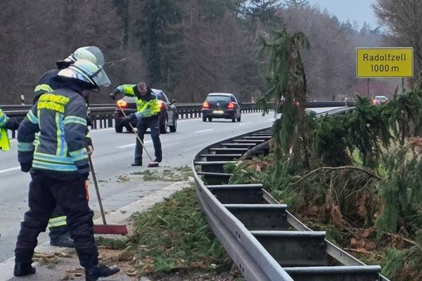 Gegen 16:00 Uhr stürzte ein etwa 15 Meter hoher Baum auf die B 33 und blockierte die rechte Fahrspur. Die Einsatzkräfte entfernten den Baum von der Fahrbahn.