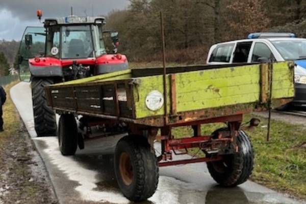 Am 12.02.26, gegen 13.50 Uhr, meldete sich der Fahrer eines Traktors, der unterwegs mit Weinbergpfählen war, die er zur Altmetallentsorgung nach Annweiler fahren wollte, diese waren auf einem Anhänger geladen. Auf der B48, zw. Abfahrt Wernersberg und Annweiler, löste sich die Gelenkwelle vom linken Vorderrad des Anhängers, hierdurch riss die Hydraulikwelle zwischen Zugfahrzeug und Anhänger und mehrere Liter Hydrauliköl flossen auf die B48 und den danebenliegenden Fahrradweg. Da nicht ausgeschlossen werden konnte, ob Öl ins Erdreich sickerte, wurde die Untere Wasserbehörde verständigt. Die Fahrbahn musste durch eine Spezialfirma gereinigt werden. Weiter konnte festgestellt werden, dass der Anhänger ohne gültiges Kennzeichen geführt wurde. Neben den erheblichen Kosten für die Reinigung der Fahrbahn, wurde eine Anzeige wegen des Verstoßes gegen das Pfichtversicherungs-und Kraftfahrzeugsteuergesetzes eingeleitet.