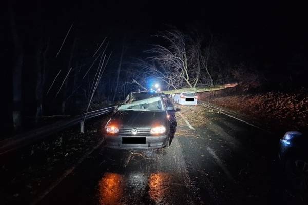 Nach bisherigen Erkenntnissen, befuhren ein Pkw VW Golf und ein Ford C-Max die Kreisstraße, als die Fahrzeugführer den umstürzenden Baum bemerkten. Trotz des Versuchs diesem auszuweichen, wurden beide Autos von dem umstürzenden Stamm getroffen. Dieser schlug bei den Fahrzeugen im Bereich des Dachs und der Windschutzscheibe ein. Die 24 Jahre alte Fahrerin des Ford und der 38-jährige VW-Fahrer blieben bis auf einen Schock unverletzt. Auch ein 9 Jahre altes Kind, das sich als Beifahrer in dem VW Golf befand, erlitt einen Schock.