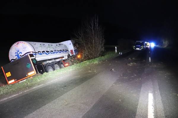 Das Lkw-Gespann musste aufwändig mit zwei Spezialkränen aus dem Graben gehoben und abgeschleppt werden. Während der Unfallaufnahme und Bergung war die Strecke etwa sieben Stunden lang für den Verkehr gesperrt.
