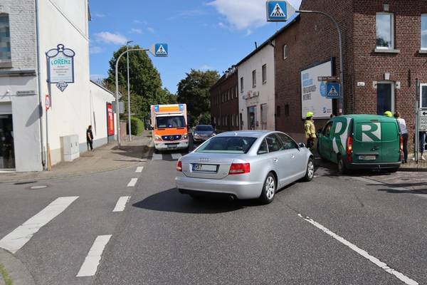 Die Feuerwehr Gangelt wurde heute Nachmittag um 15:33 Uhr zu einem Verkehrsunfall in Höhe des Marktplatzes alarmiert. Aus bislang ungeklärter Ursache stieß auf der Kreuzung Sittarder Straße / Marktplatz / Frankenstraße ein Audi mit einem Mercedes Kastenwagen zusammen. Durch die Wucht des Aufpralls wurden die beiden Fahrzeuge erheblich beschädigt. Die Beifahrerin des Audi wurde hierbei leicht verletzt und musste zur weiteren Kontrolle in ein Nahe gelegenes Krankenhaus transportiert werden. Der Fahrer des Audi sowie die beiden Insassen des Mercedes blieben unverletzt. Die Feuerwehr sicherte die Einsatzstelle, beseitigte die ausgelaufenen Betriebsstoffe und half bei der Bergung der Unfallfahrzeuge. Für die Dauer der Rettungs- und Bergungsarbeiten musste die L47 in Höhe des Marktplatzes etwa eine Stunde lang gesperrt werden. Im Einsatz war die Löscheinheit Gangelt mit etwa 15 Einsatzkräften.