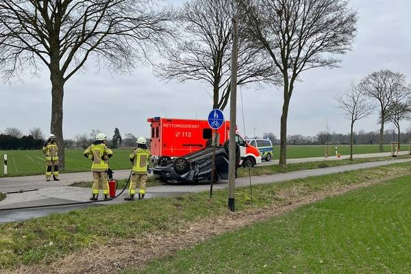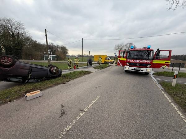 Kurz vor Mittag am Aschermittwoch wurde die gesamte Feuerwehr der Gemeinde Rheurdt zu einem Verkehrsunfall mit einer eingeklemmten Person auf die Bahnstraße im Ortsteil Rheurdt alarmiert. An einer Einmündung waren zwei Fahrzeuge so kollidiert, dass eines der Fahrzeuge auf dem Dach zum Liegen kam und auf dem Fahrradweg liegen blieb.