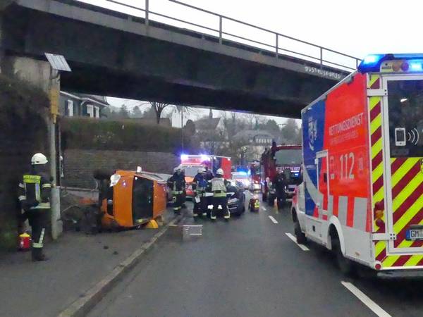 Am Dienstagnachmittag (24. Februar, 15:10 Uhr) kam es auf der Brückenstraße in Gummersbach zu einem Verkehrsunfall, bei dem zwei Autofahrerinnen aus Gummersbach leicht verletzt wurden. Eine 69-Jährige fuhr mit ihrem Golf auf dem linken Fahrstreifen der zweispurigen Brückenstraße in Richtung der "Westtangente". Als sie den Fahrstreifen wechselte, kam es zum Zusammenstoß mit dem Polo einer 62-Jährigen, welche in gleicher Richtung, auf dem rechten Fahrstreifen unterwegs war. In der Folge kam der Polo nach rechts von der Fahrbahn ab, kollidierte mit einem Metallzaun und kippte schließlich auf die linke Fahrzeugseite. Die Gummersbacherinnen wurden zur ambulanten Behandlung in ein Krankenhaus gebracht, ihre Autos waren nicht mehr fahrbereit und mussten abgeschleppt werden. Die Brückenstraße, in Fahrtrichtung "Westtangente", musste für die Dauer der Unfallaufnahme gesperrt werden und konnte nach etwa 90 Minuten wieder für den Verkehr freigegeben werden. Der Verkehrsunfall ereignete sich unweit der Einmündung zur "Hohe Straße".