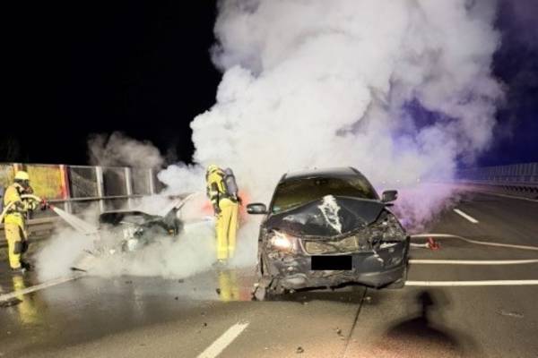 Remscheid (ots) - Gegen 6:30 Uhr wurde die Feuerwehr Remscheid zu einem Verkehrsunfall auf der BAB alarmiert. In Fahrtrichtung Dortmund kam es etwa einen Kilometer vor der Anschlussstelle Remscheid-Lennep zu einer Kollision zwischen zwei Pkw, von denen einer unmittelbar in Brand geriet.