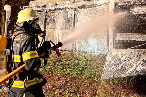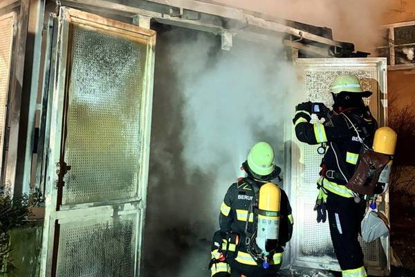Um 2.31 Uhr wurde der Feuerwehr Feuerschein aus dem Innenhof einer Wohnanlage in der Rimstinger Straße gemeldet. Beim Eintreffen der Feuerwehr war ein Unterstand für Großraummülltonnen bereits im Vollbrand. Durch die starke Hitzeentwicklung entstanden erhebliche Sachschäden an einem nahestehenden Gebäude und einer Straßenlaterne. Die Flammen konnten mit dem Einsatz von Löschschaum schnell unter Kontrolle gebracht werden. Um sicher alle Glutnester ablöschen zu können, musste eine Tür mit einem Winkelschleifer geöffnet werden. Die nahestehenden Gebäude wurden durch die Feuerwehr kontrolliert. Der Unterstand wurde durch die Brandeinwirkung stark beschädigt und drohte einzustürzen, weshalb der umliegende Bereich weiträumig abgesperrt wurde.