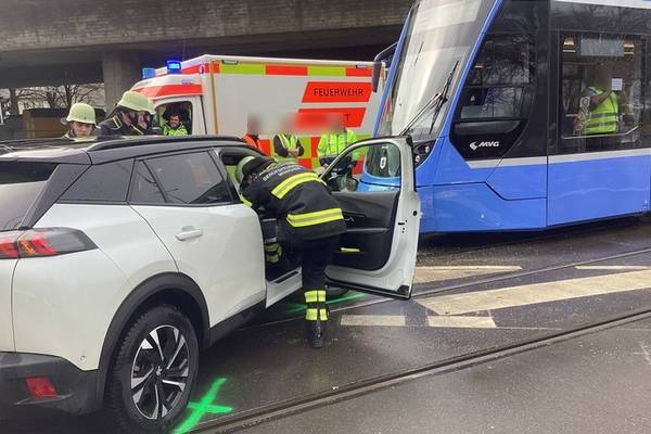 Bei Eintreffen der ersten Kräfte bestätigte sich eine zunächst gemeldete Entgleisung der Straßenbahn infolge des Unfalls glücklicherweise nicht. Die Bahn der Linie 21, die in Richtung St.-Veit-Straße unterwegs war, und ein weißes Fahrzeug kollidierten im Kreuzungsbereich so, dass das Auto stark auf der Fahrerseite beschädigt wurde und die Airbags auslösten. Die Tram wurde ebenfalls im Frontbereich beschädigt. Während die Feuerwehr die Unfallstelle absicherte, wurden zwei leicht verletzte Personen in einem Rettungswagen untersucht. Beide konnte nach einer kurzen Versorgung aber vor Ort bleiben und mussten nicht ins Krankenhaus. Nach der Unfallaufnahme durch die Polizei unterstützte die Feuerwehr beim Freiräumen der Fahrbahn.