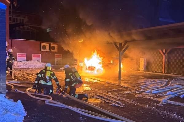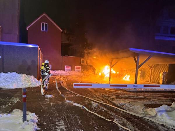 Den Feuerwehrleuten war beim Eintreffen sofort ersichtlich, dass es sich bei dem gänzlich in Flammen stehenden Kleinwagen um ein Elektrofahrzeug handelte. Atemschutzgeräteträger gingen in der Folge mit mehreren Strahlrohren vor, um den Brand zu bekämpfen und eine weitere Ausdehnung zu unterbinden. Innerhalb des Carports waren darüber hinaus mehrere Ladestationen installiert, die es ebenfalls zu schützen galt. Durch ihr zielgerichtetes Eingreifen dämmten die Einsatzkräfte das Feuer schon nach kurzer Zeit weitestgehend ein.