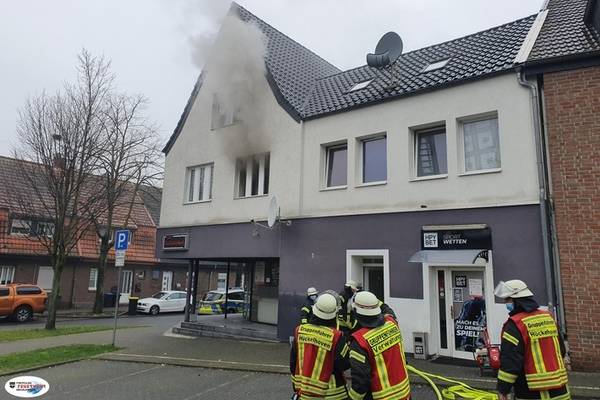 Hückelhoven (ots) - Gemeldeter Zimmerbrand "Menschenleben in Gefahr" Die Feuerwehr Hückelhoven wurde heute Vormittag 04.03.21 gegen 10:00 Uhr zu einem Zimmerbrand mit "Menschenleben in Gefahr" alarmiert. Laut erster Meldung sollte massiver Rauch aus einem Wohnhaus dringen und nicht bekannt sein, ob sich noch Bewohner im Haus aufhalten würden. Bei dem Brandobjekt handelte es sich um ein Eckhaus mit einem Vereinslokal im Erdgeschoß. Durch die ersten Einsatzkräfte konnte an der Einsatzstelle eine massive Rauchentwicklung am Wohnhaus im ersten Obergeschoß festgestellt werden. Ein Bewohner konnte vor der Brandobjekt angetroffen werden und teilte mit das vermutlich alle Personen das Haus verlassen hätten. Sofort wurde ein Atemschutztrupp mit Hohlstrahlrohr und einer Wärmebildkamera eingesetzt, der in das erste Obergeschoß vorging, um die Brandstelle ausfindig zu machen. Durch einen weiteren Atemschutztrupp wurden die Räume auf Personen abgesucht wobei mehrere Türen gewaltsam geöffnet werden mussten. Hierbei konnte eine Person in einem Nachbarzimmer angetroffen und umgehen aus dem Hause geführt werden. Durch den Rettungsdienst wurde die Person mit einer Rauchvergiftung erstversorgt und anschließend einem Krankenhaus zugeführt. Vorsorglich wurde die Drehleiter vorbereitet, um unverzüglich eingesetzt werden zu können was zum Glück jedoch nicht nötig war. Nachdem der Brandraum lokalisiert werden konnte, wurde die Brandstelle ein Kühlschrank abgelöscht und anschließend ins freie transportiert. Um die verrauchten Zimmer zu entrauchen, wurde im Anschluss ein Hochleistungslüfters eingesetzt, der die Wohnräume entrauchte. Das Brandobjekt konnte nach Abschluss der Maß nahmen durch die Feuerwehr an dem Eigentümer übergeben werden