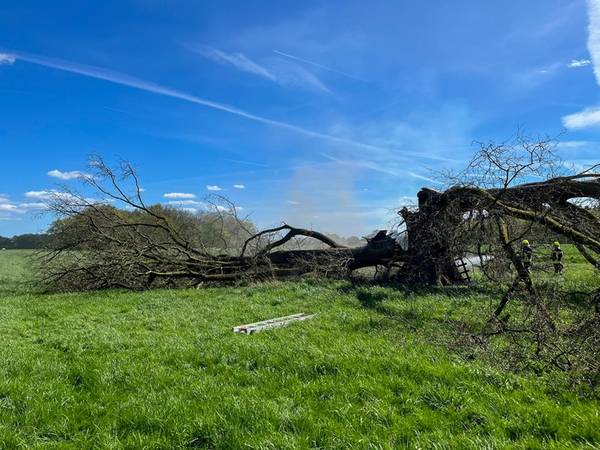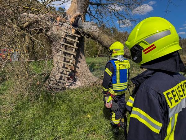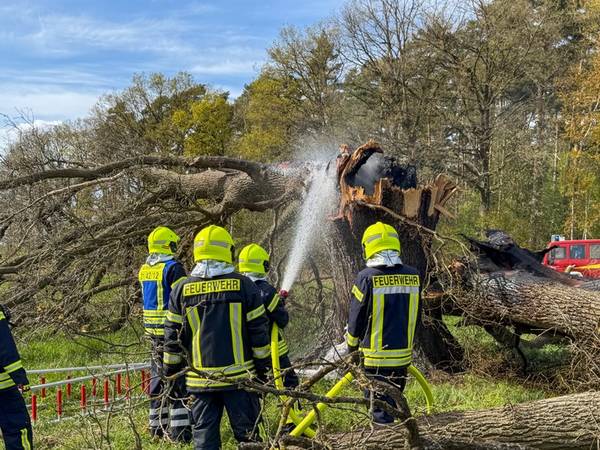 Ersten Erkenntnissen zufolge waren ein Hochsitz sowie eine mächtige Eiche in Brand geraten. Da der Baum bereits im Stamm und im Astwerk brannte, musste er unter Zuhilfenahme eines landwirtschaftlichen Fahrzeugs und einer Motorkettensäge so weit abgetragen werden, dass die Einsatzkräfte den Brandherd von innen heraus löschen konnten. Um alle Glutnester zu erreichen, kam unter anderem Netzmittel zum Einsatz. Die Löscharbeiten dauerten knapp zweieinhalb Stunden.