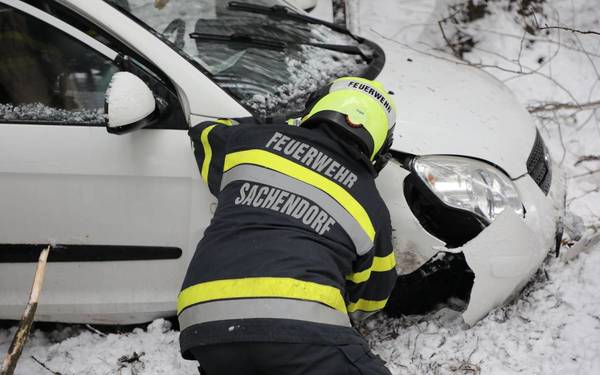 Während sich die Sanitäter um die verletzte Lenkerin kümmerten, stellte die Feuerwehr den doppelten Brandschutz sicher und barg das Fahrzeug aus dem Unterholz.